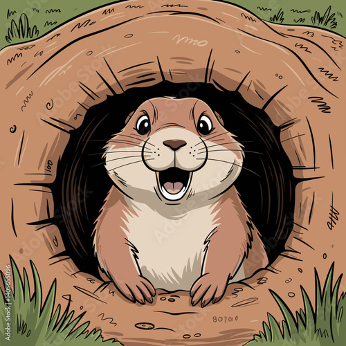 Cartoon Groundhog Emerging from Burrow Looking Upward Vector Illustration.