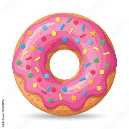 Donut isolated on a white background. Cute, colorful and glossy donuts with pink glaze and multicolored powder. Simple modern design. Realistic vector illustration.