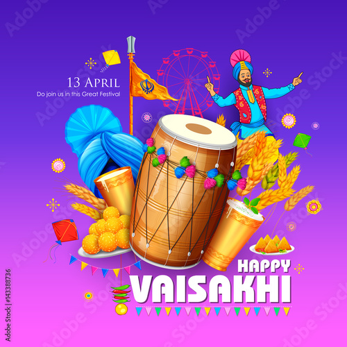 Vector illustration for happy Baisakhi, Indian punjabi festival with festival theme elements.int