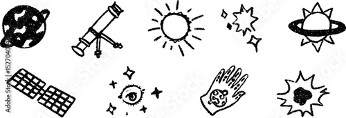 Space planets and stars in a black and white vector illustration set. Featuring various celestial shapes and textures in a simple design.