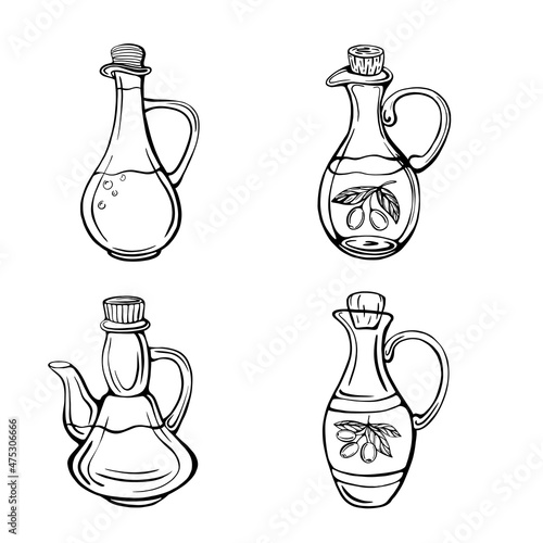 Hand-drawn set of olive oil bottle isolated on a white background. Extra virgin olive oil. Vintage style. Vector illustration in Doodle style