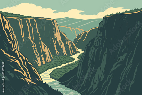 Vector art of majestic canyon landscape with a winding river, towering cliffs, and lush vegetation, creating a serene and picturesque scene perfect for nature lovers