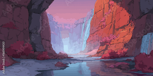 Stylized illustration of a majestic canyon gorge at sunset with warm, layered colors.