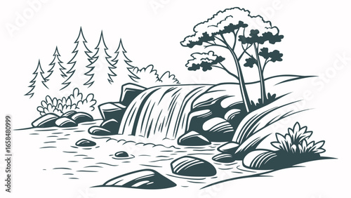 Highland river tumbling over boulders in a steep gorge with mossy walls, a black and white sketch vector