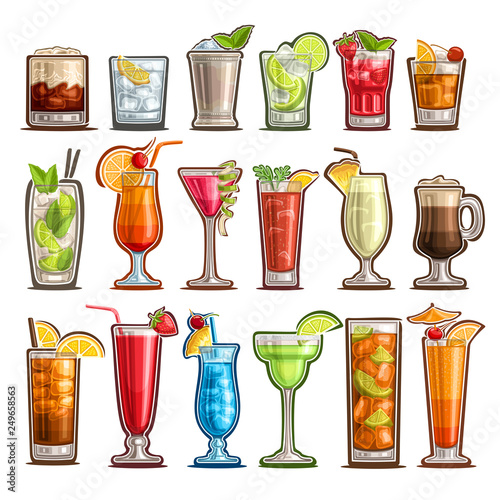 Cocktails and drinks set. Alcoholic beverage pina colada and americano bloody mary with summer paradise martini tequila sunrise rose and vector mojito martini