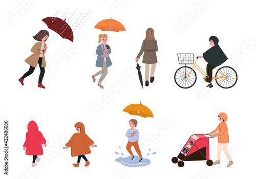 People walk in bad weather. Walk in the fall and winter in the rain. Set of isolated characters. Vector illustration.