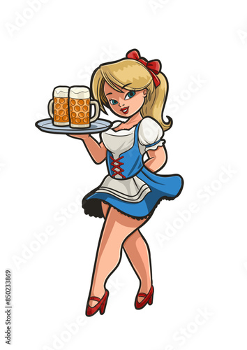 Retro-style illustration of a woman holding two glasses of beer. Vector, generative ai.
