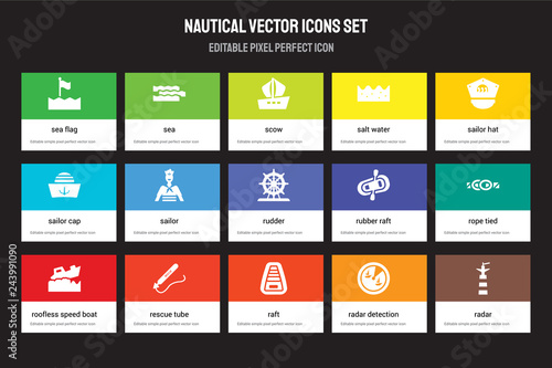 Set of 15 flat nautical icons - sea flag, Sea, Raft, Sailor Hat, Roofless Speed Boat, Rubber Rope Tied, Radar detection. Vector illustration isolated on colorful background