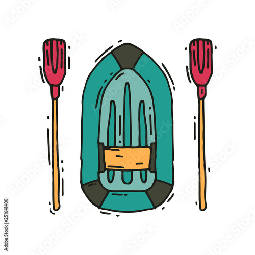 Hand drawn vector design of inflatable rubber boat and two paddles, top view. Outdoor adventure. Fishing and tourism