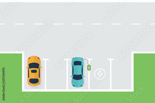 Electric car or EV car charging at  Charging Station in Parking Space Aerial View. Green Energy or Eco-friendly Concept. Vector Illustration.