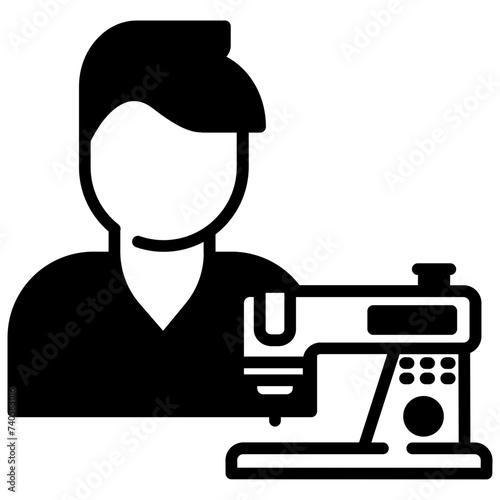 Illustration of a Man Sewing Blue Fabric with a Sewing Machine, Demonstrating Tailoring and Craftsmanship