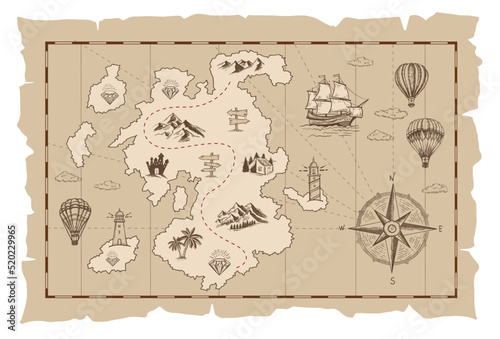 Antique treasure map. Cartoon island map template for next level game - adventures quest or treasure hunt. Pirate grunge map with windrose and dragon. Hand drawn vintage vector illustration