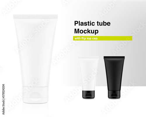 White and black plastic tube mockup with flip top cap. Vector illustration isolated on white background. Can be use for your design, advertising, promo and etc. EPS10.