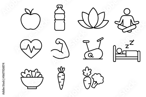 Set of minimalist icons: balance, time, technology, meditation, coffee, home, calendar, workspace, nature, love