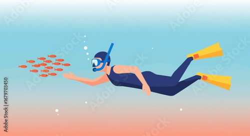Tranquil vector illustration of a person relaxing in a beach chair under an umbrella watching the sunset over the ocean on a tropical paradise.