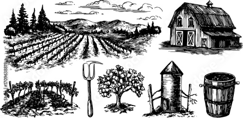 Vintage hand-drawn sketch vector of a rural countryside farm with fields and barn, great for rustic prints or agricultural themes.