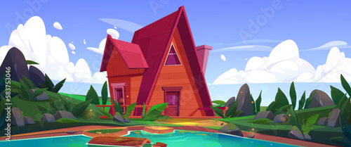 Modern house in woods landscape. Cartoon cottage in forest, a-frame in park and lake, rural house with cabin and boat. Vector landscape