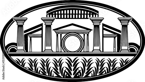 Illustration of a classic building with pillars, clouds, and stars inside a circle.