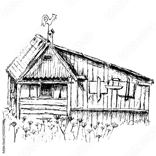 Hand drawn illustration of chicken coops in two different black and white design styles