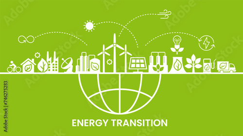ENERGY TRANSITION. Transition to environmentally friendly world concept.  Ecology infographic. Green power production. Transition to renewable alternative energy.