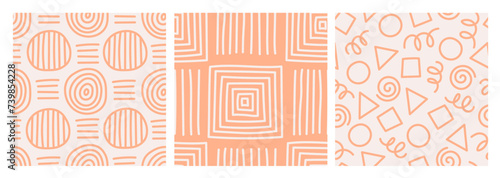 Abstract Geometric orange seamless patterns set. Collection of hand drawn endless backgrounds. Trendy Peach fuzz color with various lines squiggles and shapes. Repeat vector illustration.
