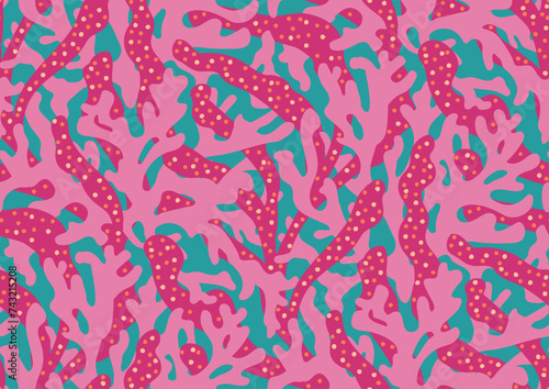 Seamless vector pattern with trailing corals and algae. Trendy peach fuzz pantone, pink yarrow, turquoise colors. for beach swimsuit, sport active wear print, fabric, textile, wallpapers