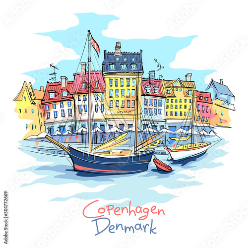 Docked fishing boat in a quiet northern harbor, a black and white sketch vector hand drawn