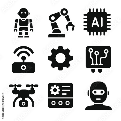 Robotics Icons Grid. Robotics. Filled icon set of robotics: humanoid robot, robotic arm, drone, AI chip, gear,