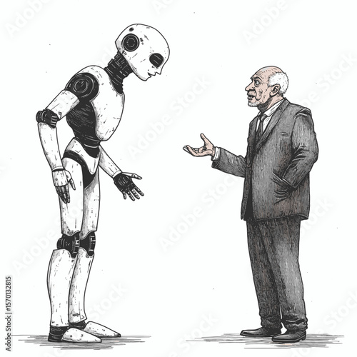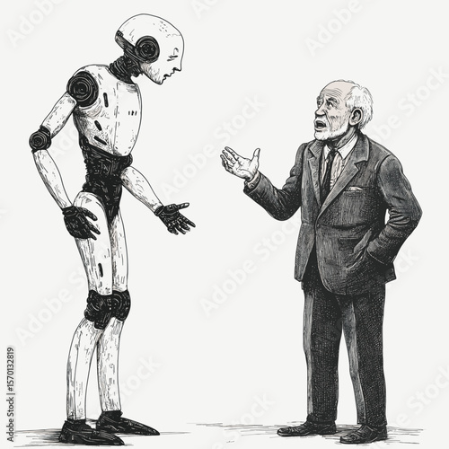 Senior man figure discussing AI with a humanoid robot
