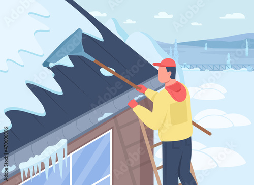 Rooftop snow removal flat color vector illustration. Clearing roof of residential estate in cold weather. Man on ladder with snow remover tool 2D cartoon characters with landscape on background