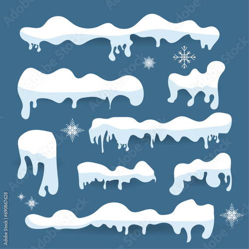 Snow caps set. White snow caps, snowball, snowdrifts, snow pile and icicles. Snowy elements on winter background. Winter elements decorations. Christmas elements. Vector illustration.