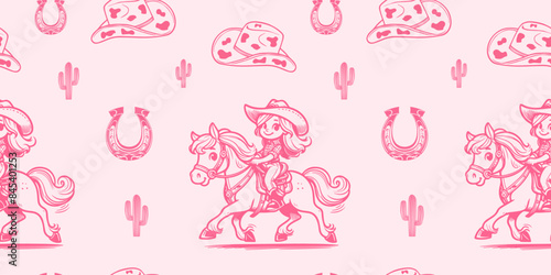 A seamless Western-themed vector pattern featuring cowboy skulls, rodeo riders, cacti, horseshoes, desert landscapes, and rustic typography.