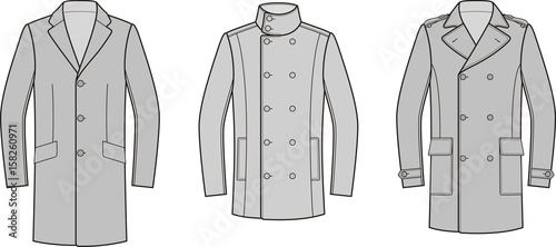 Men’s overcoat flat sketch, front and back view, single breasted coat design, fashion apparel illustration, garment construction technical drawing