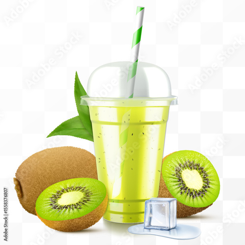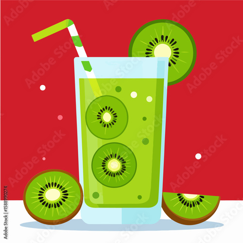 Kiwi juice in a jar with a straw stands on a white background. Vector illustration with kiwi fruit.