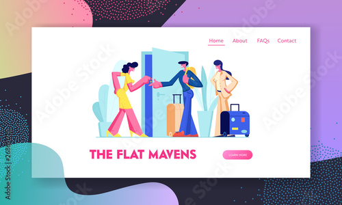 Real estate agent giving keys to new house owner. Seller, landlord, broker handing over rental apartment to man, home buyer. Property deal. Flat vector illustration isolated on white background