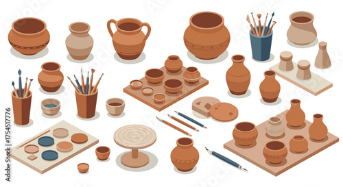 Isometric pottery workshop with shelves of clay vases and artist at work
