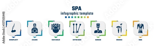 spa concept infographic design template. included rhinoplasty, cologne, hair curler, cotton buds, surgeon, brushes, robe icons and 7 option or steps.