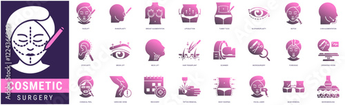 Cosmetic Surgery Icon set with microneedling,gynecomastia surgery,jaw surgery,skin grafting,sclerotherapy,caesarean,rhinoplasty,vaginal rejuvenation and arm lift