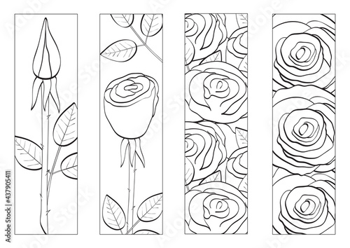 Vector set of monochrome bookmarks and doodle flowers for coloring adult coloring book.