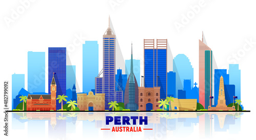 Perth Australia most famous landmarks on white background. Vector Illustration. Business travel and tourism concept with modern buildings. Image for banner or web site