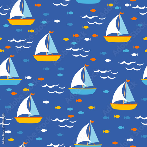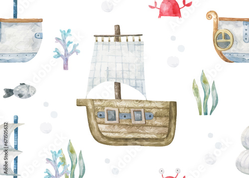 Seamless flat marine pattern set. Vibrant underwater life featuring aquatic animals like turtles, crabs, and starfish. Ocean cartoon background, playful aquatic design, ideal for summer projects or