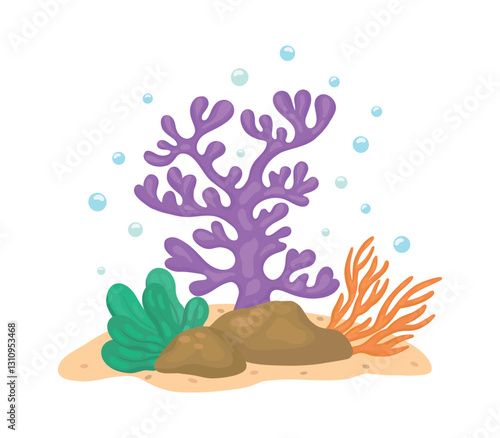 Detailed underwater plants and coral outlines. Ocean kelp, seaweed in marine aquarium set. Diverse aquatic reef life elements, isolated sea flora and doodles for coloring.