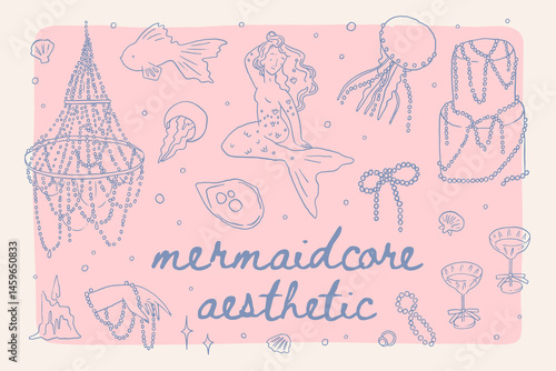 Whimsical mermaid vector elements set. Mediterranean mermaidcore illustrations. Summer coastal wedding invitation. Siren witchery sea. Ocean aesthetic bachelorette party clipart stickers collection
