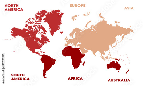 Multicolored world map divided to six continents in different colors - North America, South America, Africa, Europe, Asia and Australia Oceania. Simplified silhouette vector map with continent name