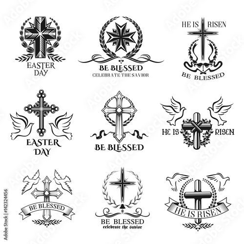 He is Risen. Celebrate the savior. Set of Easter Church posters with cross, christian motive. Vector illustration