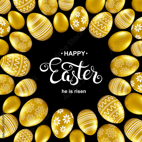 Eggs in golden style. With golden flowers and branches. vector file. Isolated on white background with a different pattern for a greeting card. Christ is risen.