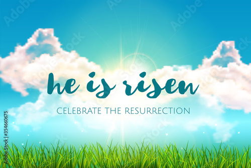 Vector Easter banner or card with words Easter Sunday, He is risen on the background of blue sky with clouds