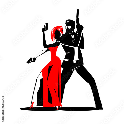 The woman super agent. In a black with a gun. Luxury car. Vector illustration