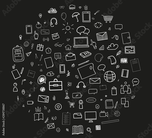 Workplace concept. Icons set. Mess on the table. Messy desk. Hand Drawn Doodle Tic Tac toe, Stationery, Food and other items that are on desktop. Back to school. Vector illustration