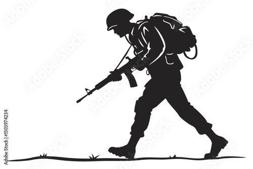 Soldier Silhouette Aiming Rifle Military Action, Combat Ready, Heroic Figure Illustration